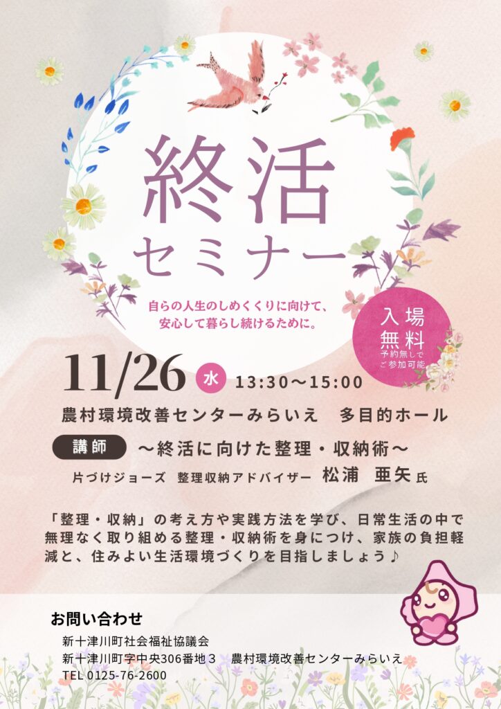 11月26日(水)13:30から、改善センターみらいえの多目的ホールにて、終活セミナーを開催します。